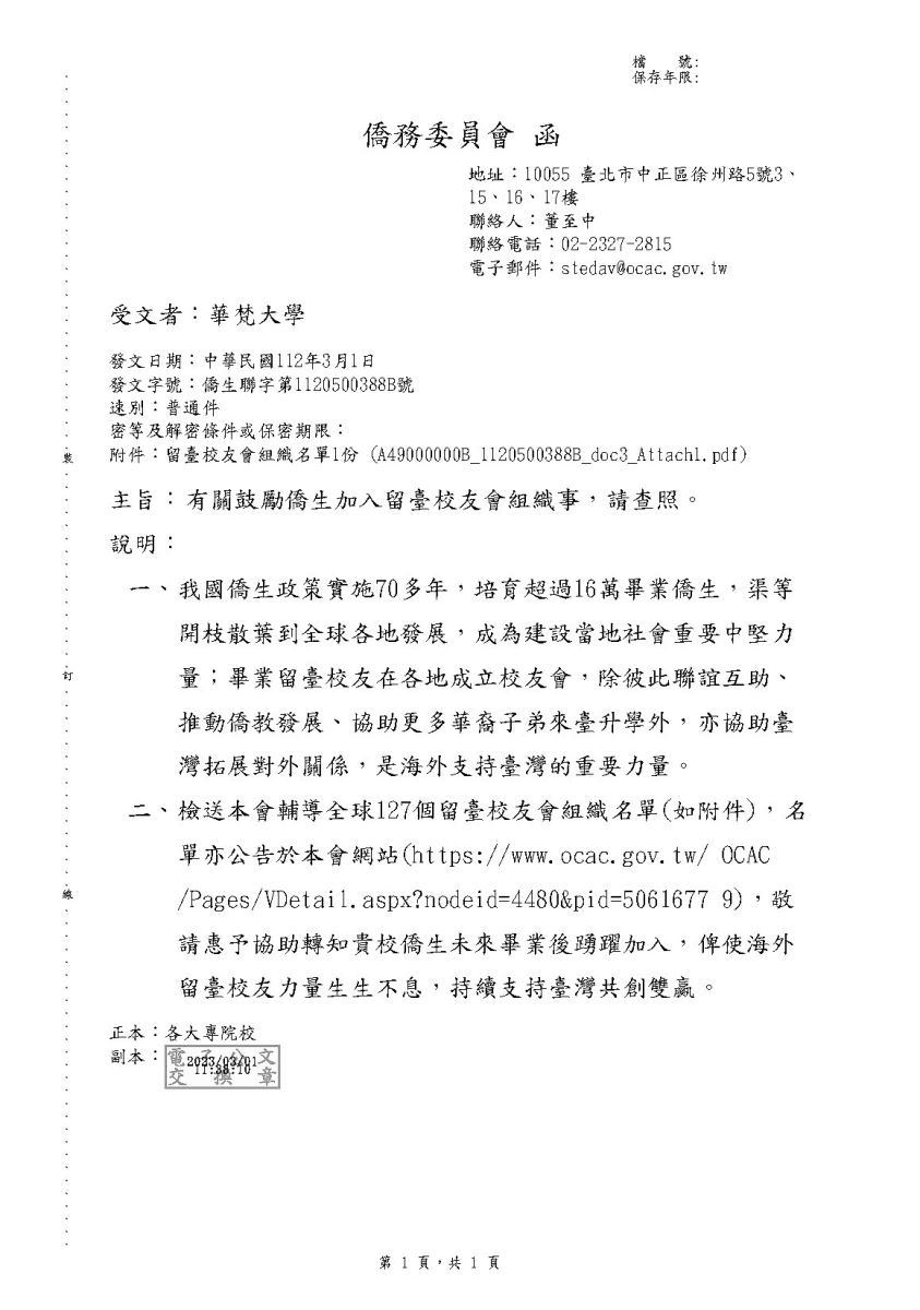 有關僑委會來函鼓勵僑生加入留臺校友會組織一事