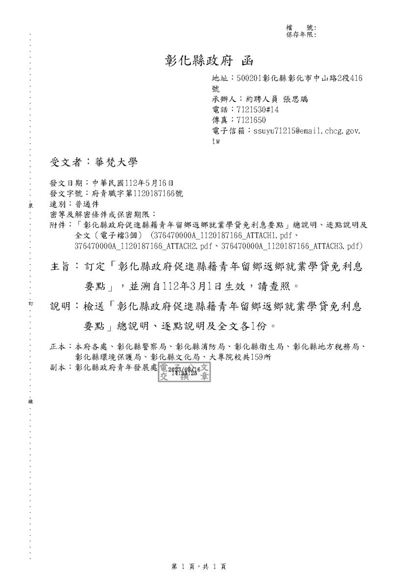 彰化縣政府促進縣籍青年留鄉返鄉就業學貸免利息要點 (溯自112.03.01生效)