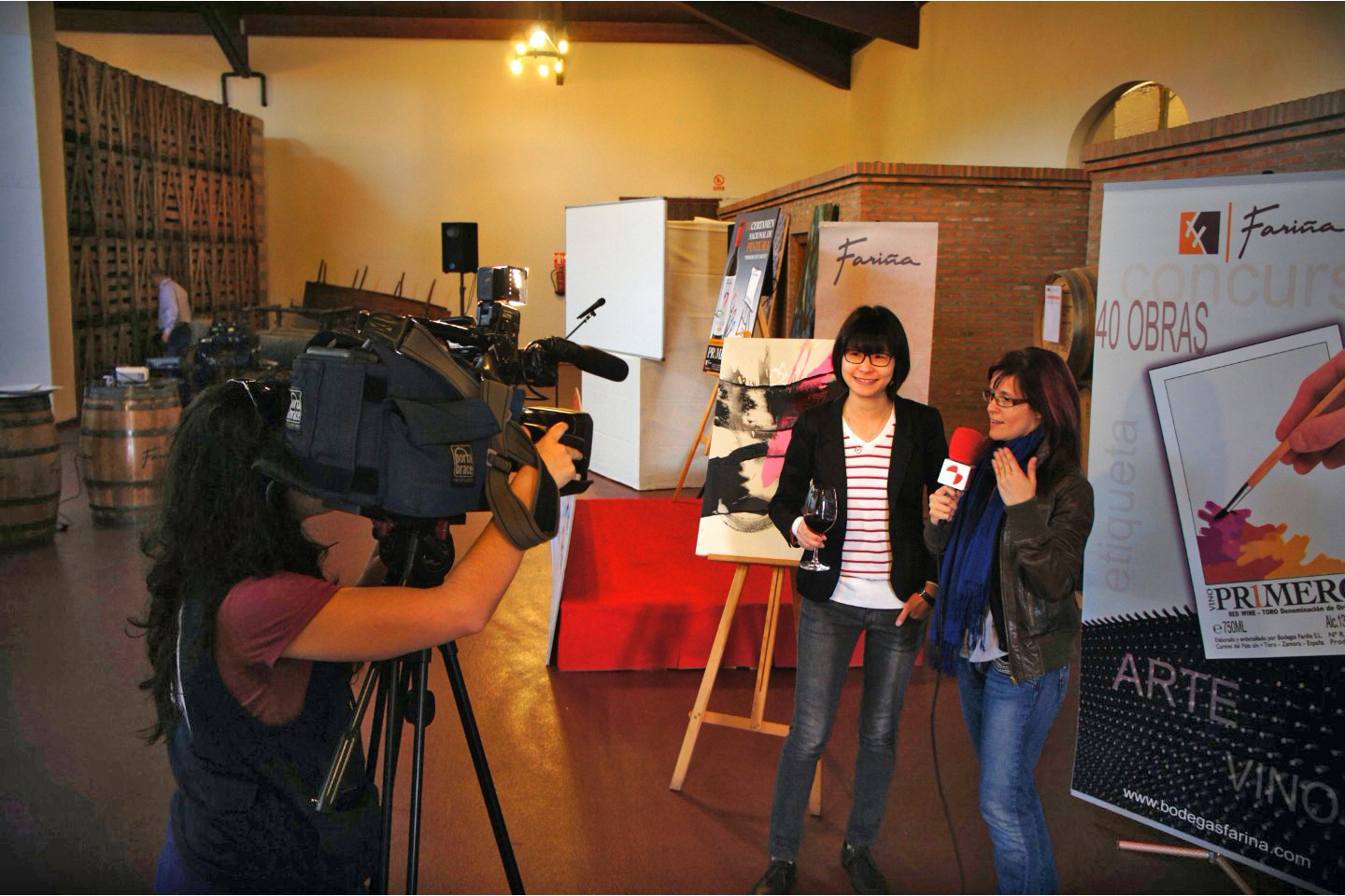 楊侖接受西班牙電視新聞媒體專訪,身後即為奪得首獎的藝術跨界紅酒畫作。
