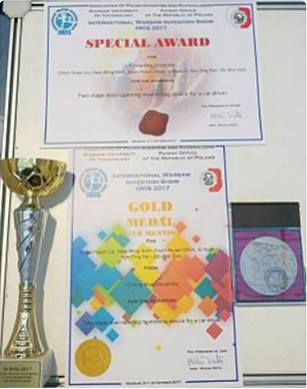 電子工程學系大二陳貫軒同學以「二段式開車門警示裝置」參加2017年「波蘭華沙國際發明展」獲得金牌與特別獎殊榮。