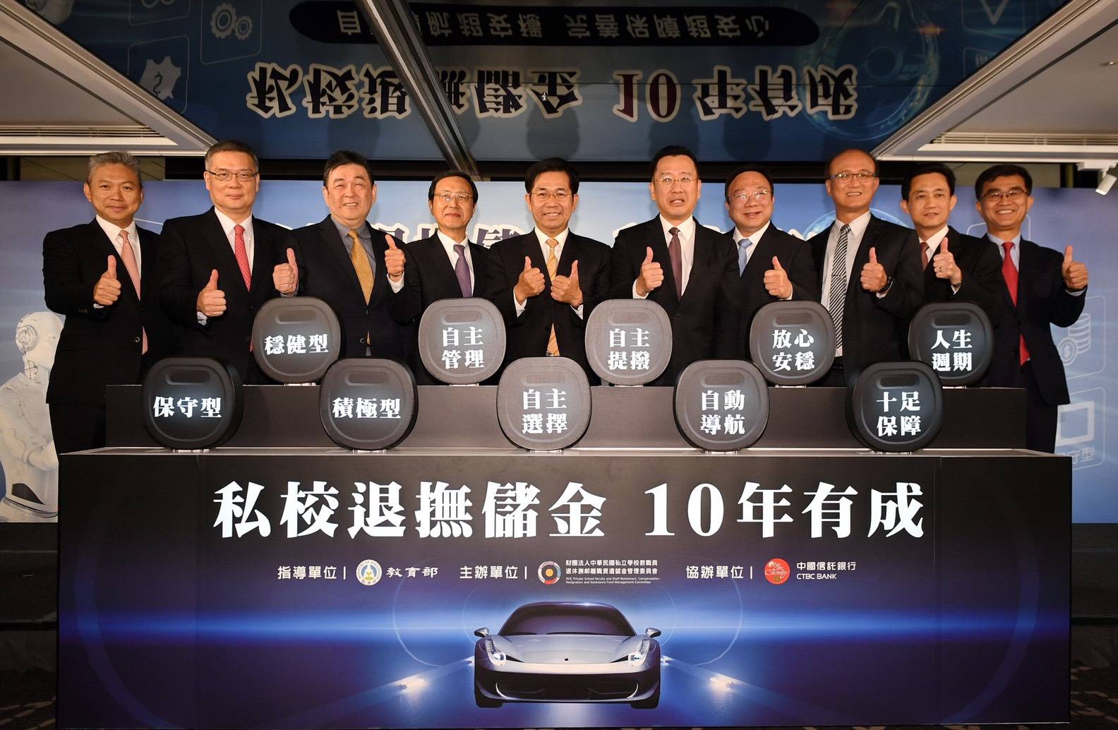 李校長(左三)及與會貴賓一同見證私校退撫儲金即將邁入下一個重要的十年。