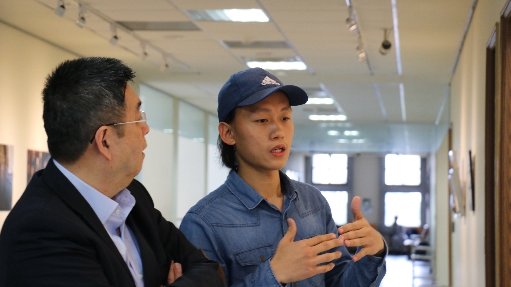 美術與文創學系黃暐翔同學向李校長介紹自己的作品