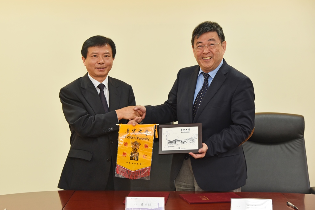 107年12月11日淮南師範學院曹杰旺校長,校辦公室主任曹燈明,國際合作與交流中心主任朱平,在本校前校長高柏園教授的陪同下訪問本校,由李天任校長親自接待。淮南師範學院貴賓除了參觀本校藝術設計學院學生的設計作品外,並與李校長深入討論兩校可能的合作事宜。會後兩校校長並簽署學術交流合作協定意願書,未來將就教師教學研究及學生交換學習等項目展開進一步的交流。