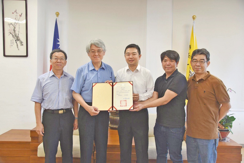 高柏園校長(左二)頒發感謝狀給電子系張一帆(中)與甄立德(右二)校友,簡江儒主任秘書(左一)、電子工程學系莊基男主任(右一)。