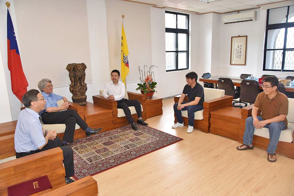 電子系張一帆、甄立德校友在電子系莊基男主任陪同下,拜會高柏園校長及簡江儒主任秘書。