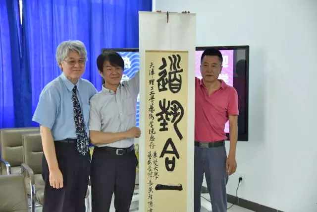 華梵大學高校長、黃智陽院長致贈天津理工大學藝術學院書法作品「道藝合一」,由藝術學院趙新華院長(右)代表接受。