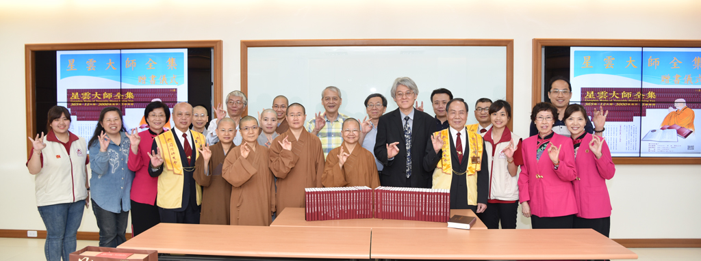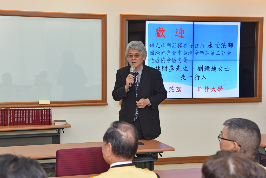 國際佛光會中華總會北區協會區委員林財盛先生及其夫人國際佛光會中華總會新莊第三分會會長劉鐘蓮女士,在佛光山新莊擇善寺住持永堂法師及多位師兄姊陪同下,於107年4月27日蒞臨華梵大學,捐贈共365冊的《星雲大師全集》一套及旋轉4面書架一座,由高柏園校長代為接受。目前該套書放置於圖書館一樓的參考室,歡迎大家踴躍前往參閱。