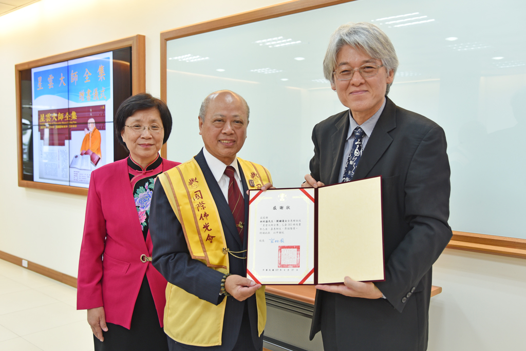 高柏園校長頒贈感謝狀:國際佛光會中華總會北區協會區委員林財盛先生(中)、國際佛光會中華總會新莊第三分會會長劉鐘蓮女士(左)。