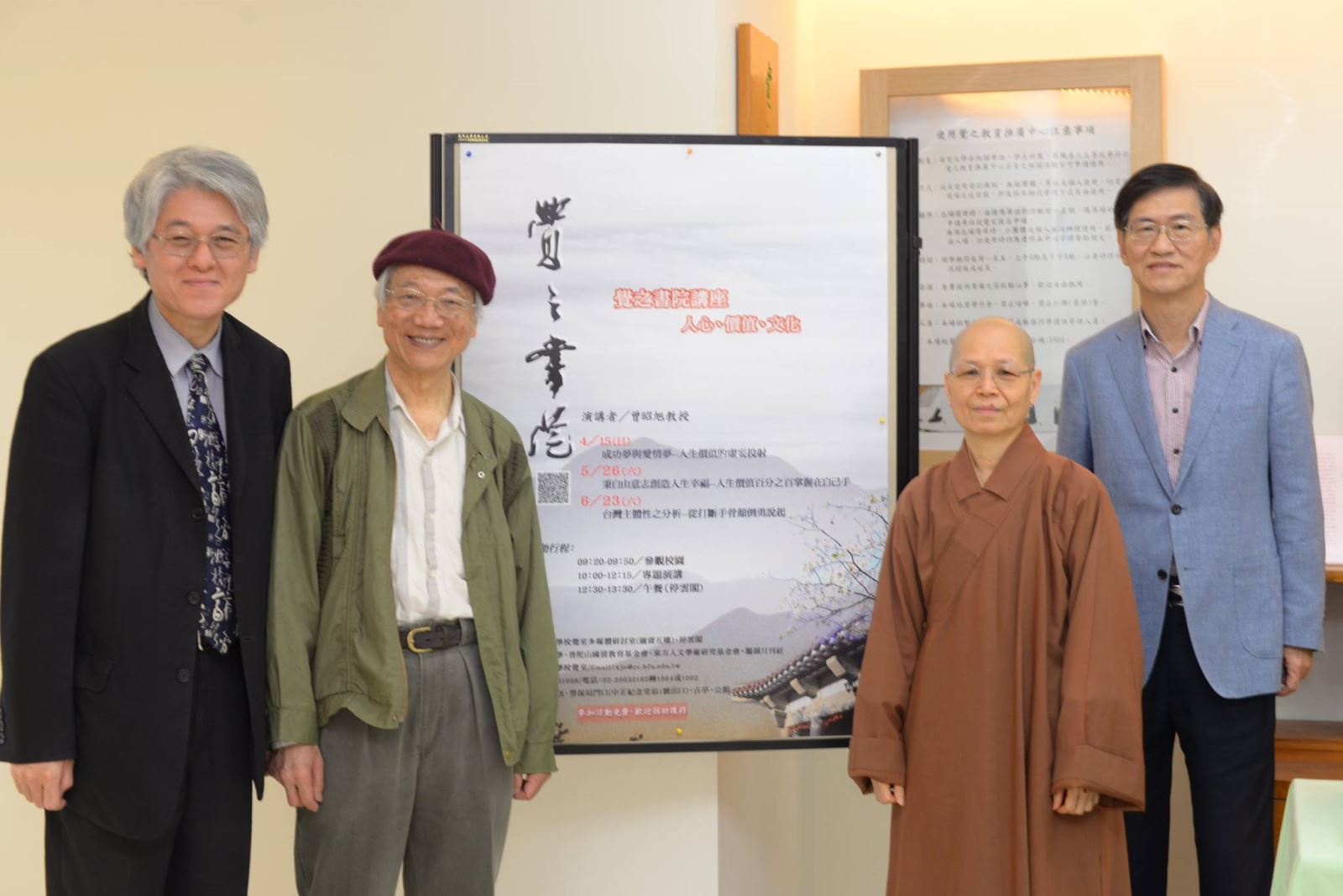 (左至右)華梵大學高柏園校長、曾昭旭教授、華梵大學董事長悟觀法師、東方人文學術研究基金會董事長朱建民教授。
