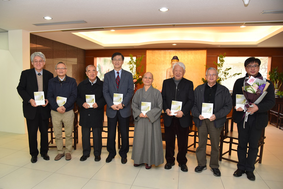 (左至右)華梵大學高柏園校長、李蕭錕教授、廖清照董事、朱建民教授、董事長悟觀法師、莊南田董事、陳榮基董事、有鹿出版許悔之社長。