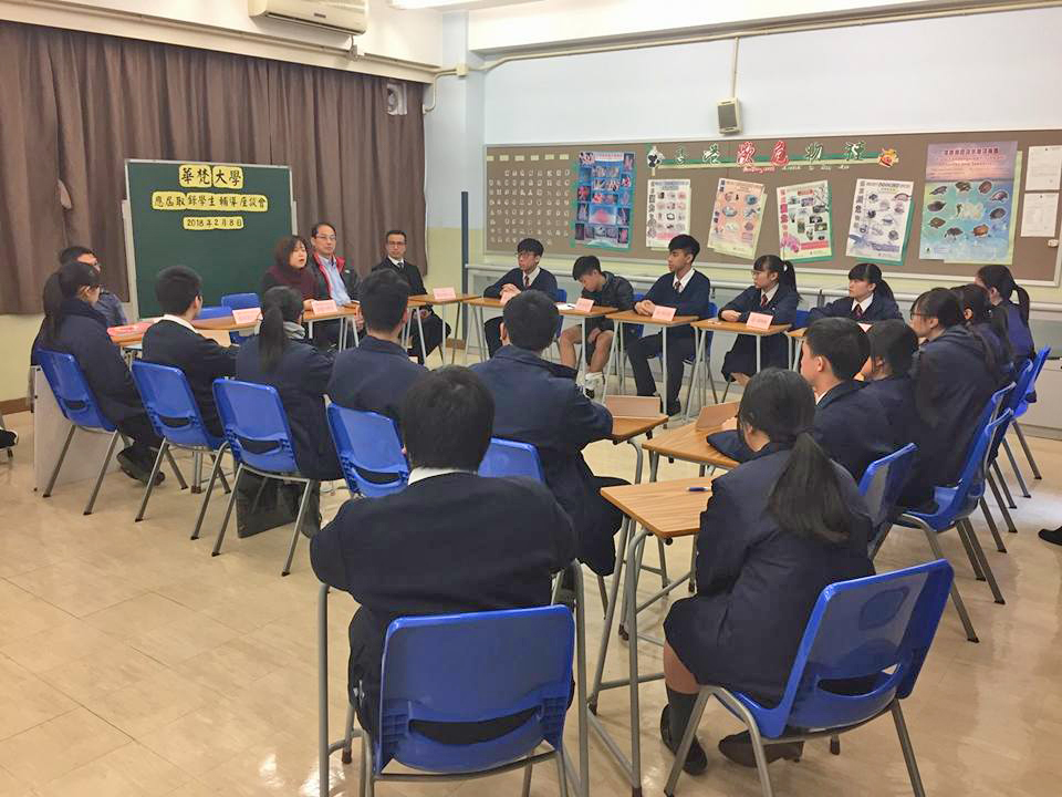 2月9日金敏玲執行長一行赴香港葉紀南中學,拜會蘇家樑校長、鄭少輝主任、黃文禧主任及謝宏邦老師,協助本校入班與中六學生座談,目前中六生已經有14人經由獨立招生進入本校,以及有兩位學生是個人申請本校。說明會現場有98位中五生及大雄中學3位學生參加,學生對於前往臺灣就學意願非常高,也詢問本校入學相關資訊。本校工業設計學系黃偉聰、哲學系李卓勳、建築學系巫穎珊同學等三位港生特地到場協助,並分享自身在校就學學習經驗與大學生活。