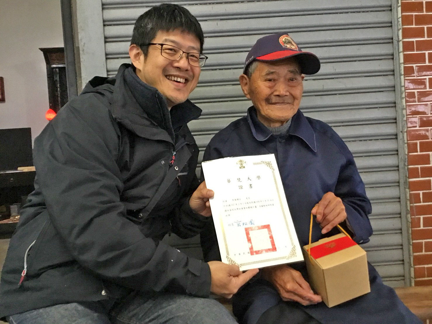 產業與社會創新學院執行長何立智老師(左)聘請新北市石碇區國寶百歲人瑞製茶師李葉煙(右)擔任華梵大學社會責任實踐計畫之「淡蘭駐地研究員」。(照片提供 林明伶)