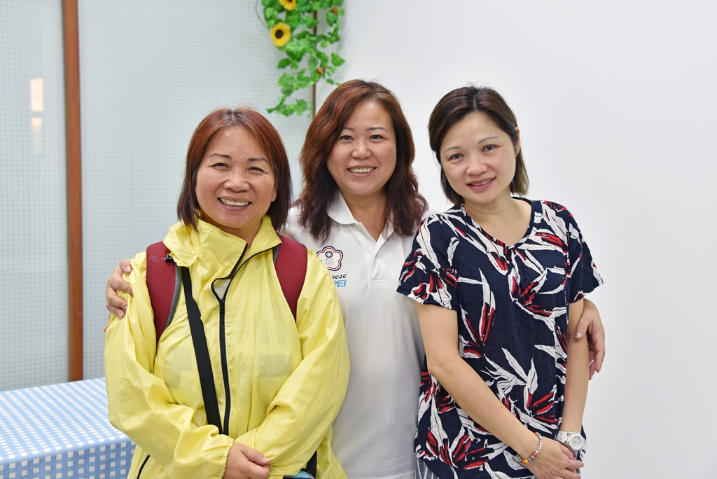 國際交流中心金敏玲執行長(中)、特別來校參訪的香港鄺錫坤中學家長周媽媽(左)及張媽媽(右)。