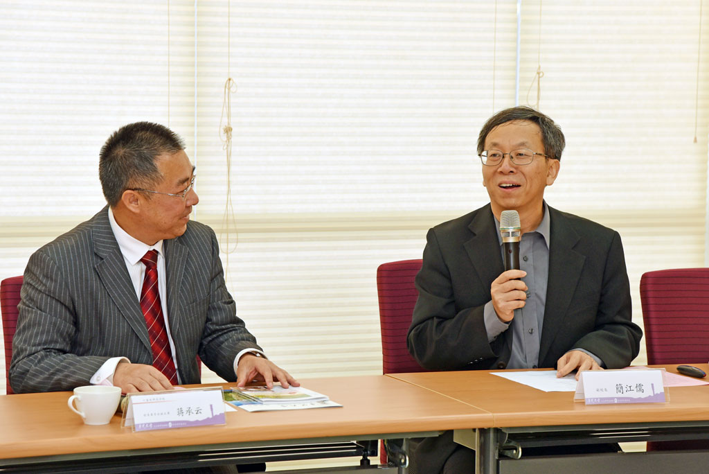 華梵大學簡江儒主任秘書致詞(右) 、六盤水師範學院校務委員會蔣承云副主席(左)。