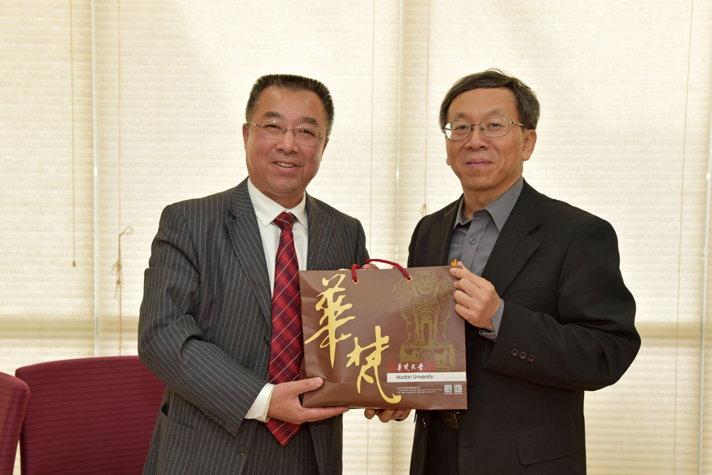 雙方致贈紀念品 : 華梵大學簡江儒主任秘書致詞(右) 、六盤水師範學院校務委員會蔣承云副主席(左)。