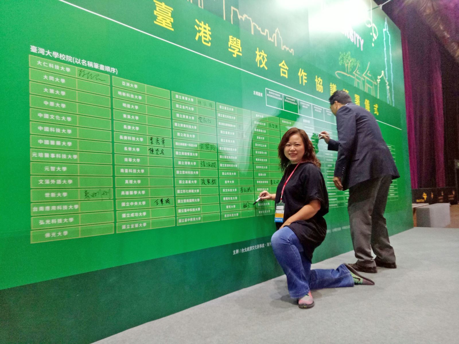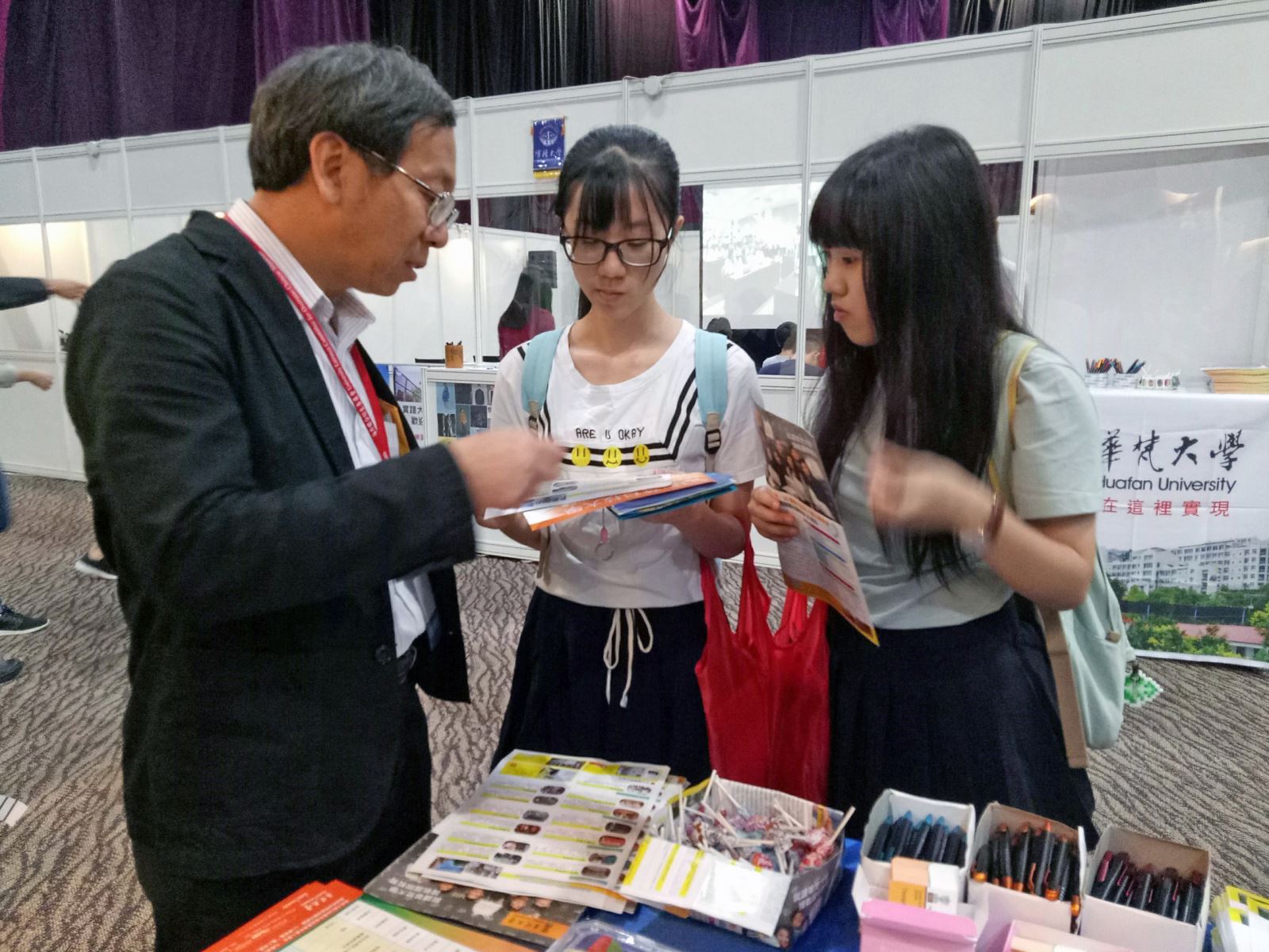 「2017香港臺灣高等教育展」共有85所臺灣髙校參展,共計有7000位師長同學參觀。教育展中,金敏玲執行長代表華梵大學上台,與香港中學簽署「臺港學校合作協議」,一起為臺港間的教育合作交流努力。有許多已經在華梵就讀的同學家長,前來敘舊與關心子弟在臺學習狀況,儼然就是小型的家長師生聯誼會,家長們很熱心的協助本校在會場的宣傳活動,互動直接且更加有效率的傳達理念,感染力十足。