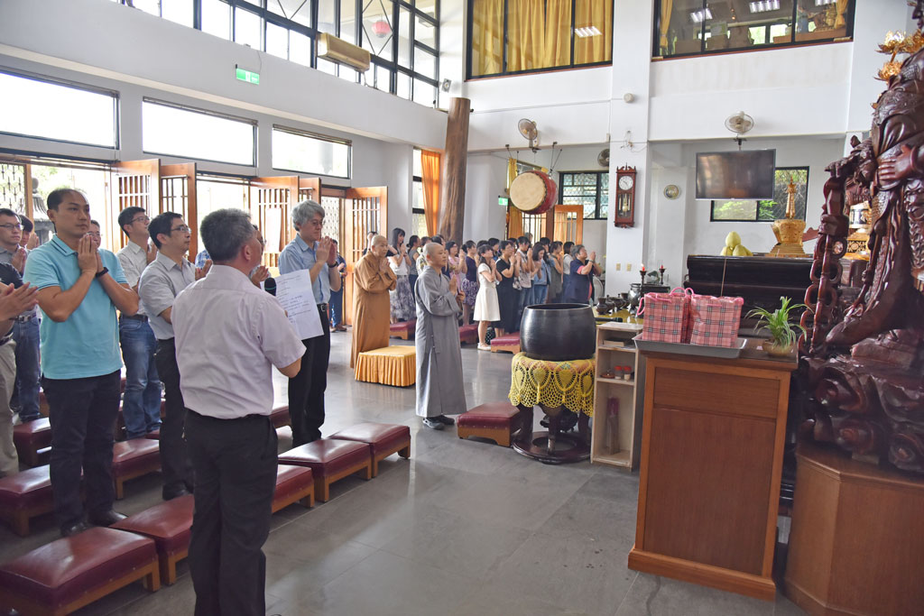 蓮華學佛園園長修慈法師率領教職員同仁向創辦人法像捻香行禮。