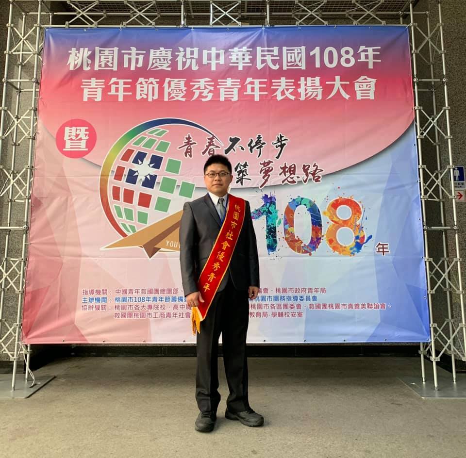 「桃園市慶祝108年青年節優秀青年表揚大會」,胡菖顯校友榮獲桃園市社會優秀青年(右三)。(照片來源:桃園市政府網頁)