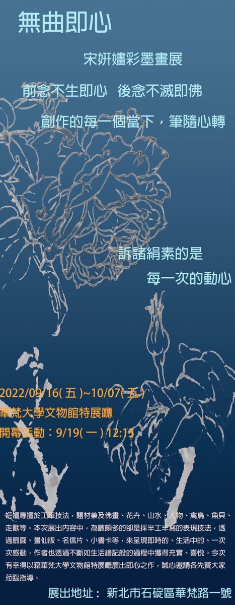 「無曲即心——宋妍嫿彩墨畫展」除了展出相當吸睛的大幅畫作,還有為數頗多的扇面、畫仙版、明信片、小書卡等,以半工半寫的技法,呈現生活中即時的心靈感動,展現生活繪記般的充實與喜悅。展期至10月7日為止,歡迎民眾前往華梵大學文物館參觀。