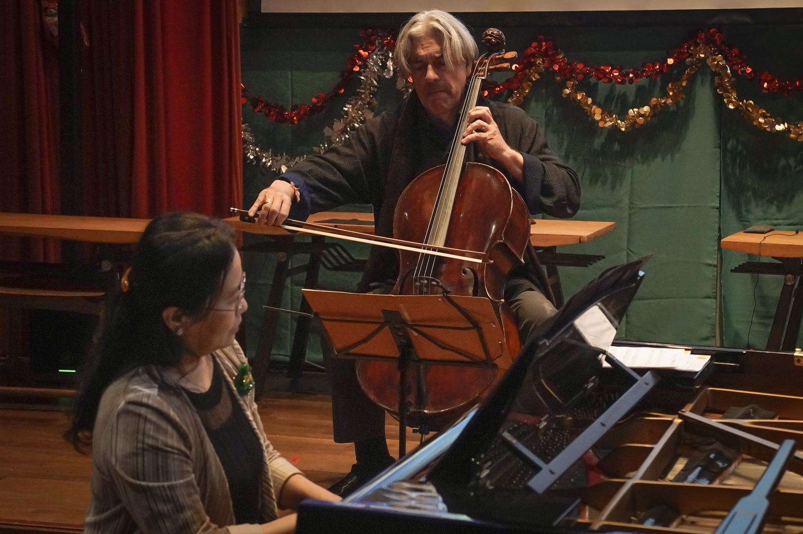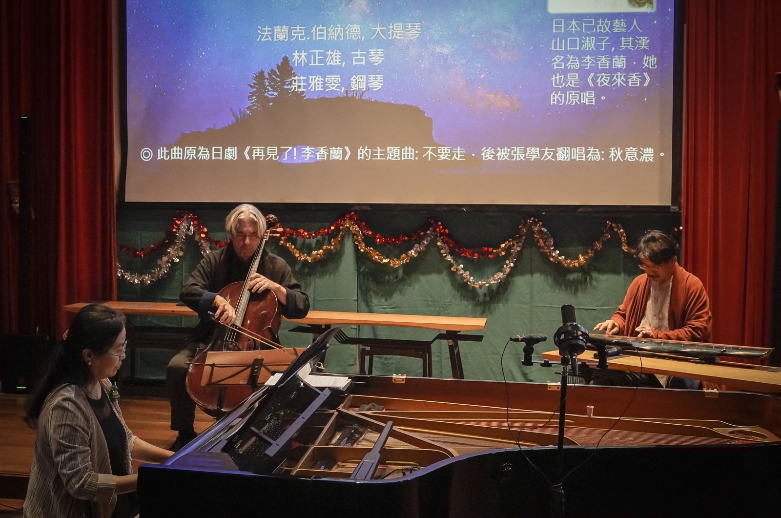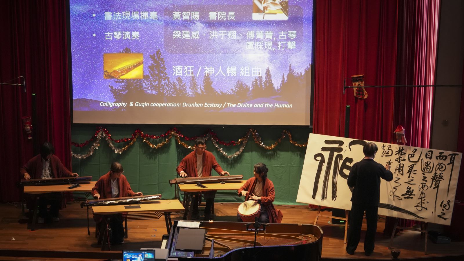 聖誕音樂會由華梵大學書院長黃智陽教授揮毫與斲一琴社四位成員開場。 震驚全台的隨機殺人事件讓社會瀰漫不安情緒,華梵大學於平安夜前夕特別舉辦跨界音樂會,邀請法國大提琴家法蘭克・伯納德,攜手留歐鋼琴家莊雅雯、古琴工坊林正雄老師與書法家黃智陽教授同台演出,透過橫跨東西、古今的音樂與藝術表演,為師生帶來溫柔而深刻的心靈療癒。 「點亮心中的微光」音樂會由任教於華梵大學人文教育中心的鋼琴演奏家莊雅雯老師策劃。 「點亮心中的微光」音樂會由任教於華梵大學人文教育中心的鋼琴演奏家莊雅雯老師策劃,23日中午在之安館國際交誼廳溫馨登場。此次演出首度將法式大提琴、史坦威鋼琴與中國千年古琴的樂音完美融合,其中一首經典歌曲〈李香蘭〉(後由張學友翻唱為〈秋意濃〉)更以三種樂器跨界合奏形式進行全球首演,古典與流行交織的嶄新詮釋,為現場師生帶來耳目一新的感動,掌聲不斷。
