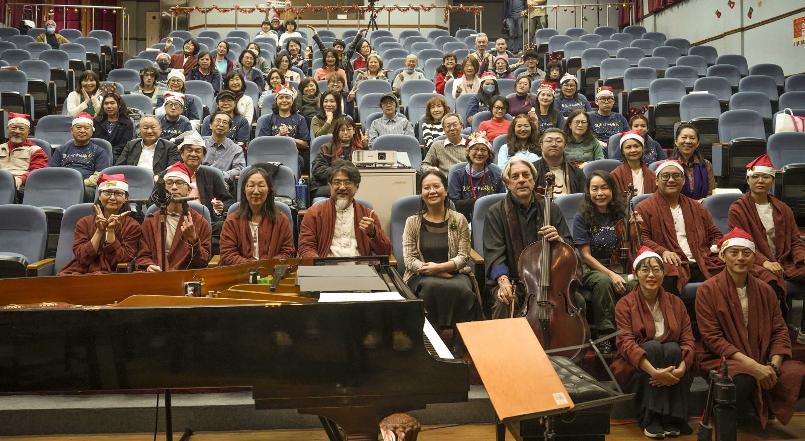 莊雅雯老師表示,伯納德博士是華梵大學的老朋友,17年前曾在同一場地演出,此次舊地重遊倍感親切。他充滿詩意的法式大提琴音色,正是撫慰人心、安定情緒的最佳療癒力量。 經典歌曲〈李香蘭〉(後由張學友翻唱為〈秋意濃〉)以三種樂器跨界合奏形式進行全球首演,古典與流行交織的嶄新詮釋,為現場師生帶來耳目一新的感動。 教務長簡江儒致詞時指出,「點亮心中的微光」音樂會結合古琴、鋼琴、大提琴與書法藝術,是難得的跨界合作典範。在社會甫發生重大事件、人心不安之際,這場演出無疑為師生與大眾帶來一場洗滌心靈的視聽饗宴。 教務長簡江儒致詞時指出,社會甫發生重大事件、人心不安之際,這場演出無疑為師生與大眾帶來一場洗滌心靈的視聽饗宴。 值得一提的是,音樂會開始前,原來學苑的小朋友與莊雅雯老師所開通識課程「音樂與生活」的修課同學,身穿音樂會專屬T恤,頭戴聖誕帽與節慶造型頭飾,設計了一場令人驚喜的報佳音快閃演出,大家一路敲敲打打,唱著「We wish you a Merry Christmas」和「Jingle Bell」,在走廊散播歡樂散播愛,還發送小禮物給路人,令全校師生驚喜不已,也成為音樂會最好的宣傳大使。 音樂會曲目橫跨東西方經典,從〈聖母頌〉、〈孔雀舞曲〉,到充滿東方意境的〈梅花三弄〉、〈普庵咒〉,最後在全體表演者合奏〈平安夜〉的祥和樂音中,全場師生手搖燭光、齊聲合唱,讓微光在音樂中流轉,也為這場充滿祝福與希望的心靈盛宴畫下圓滿句點。 「點亮心中的微光」音樂會合影留念。