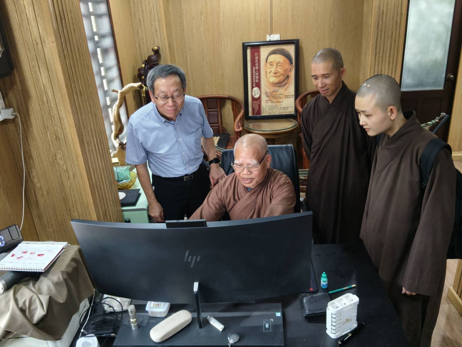 令參訪團驚豔的是,高齡68歲的行平法師展現了「活到老學到老」的精進精神。他開心分享過去一年如何運用 AI 工具,協助將中文《大藏經》翻譯為越文並加以註解。法師感嘆 AI 的強大能力,但也深刻體認到 AI 的侷限性,認為仍須透過專業訓練與人類導引,才能精準詮釋經典。這番實踐,完美詮釋了華梵大學「覺之教育」精神與現代科技的結合。 華梵大學畢業校友行平法師(左二)向華梵大學參訪團展示AI譯經成果。 ❇︎深化台越合作:攜手 Taiwan Diary 打造留學新亮點