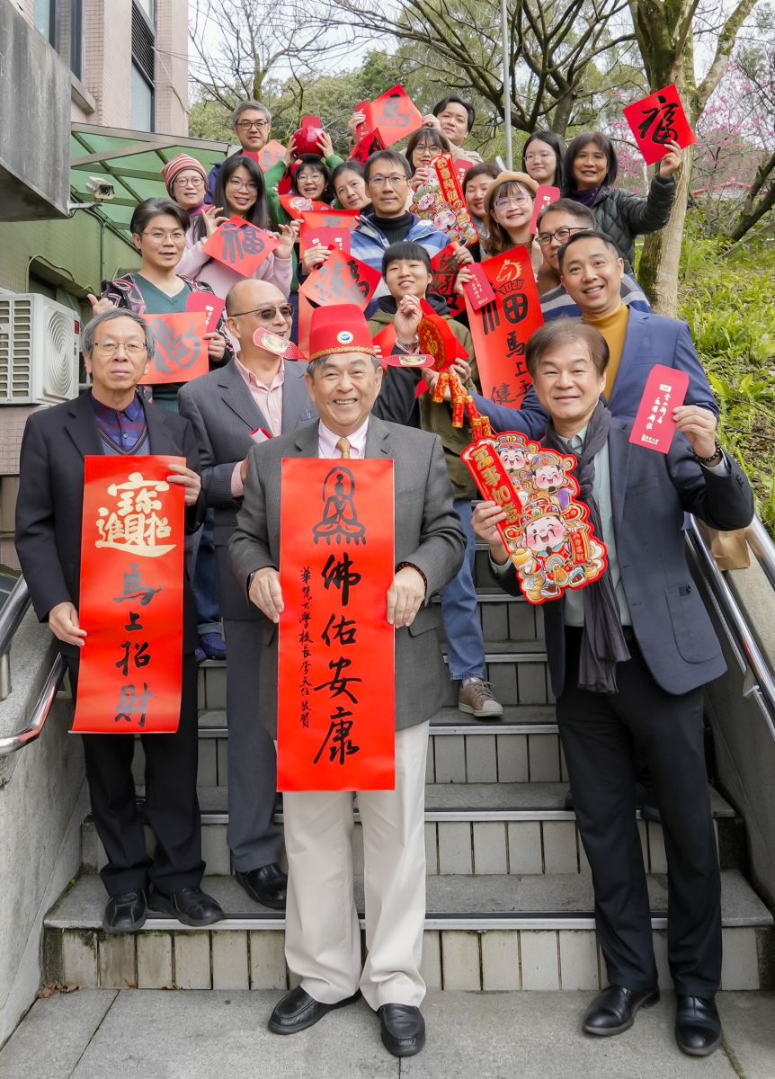 迎接馬年春節,李天任校長 ( 中 )扮財神拜年發紅包。 今日春暖花開,馬年春節即將到來,華梵大學李天任校長在過年前最後一個上班日,帶領一級主管與秘書室同仁走遍校園每一個角落,親自向堅守崗位到最後一刻、勞苦功高的華梵人拜年,並致上最高敬意與祝福。 華梵大學公共事務處全體同仁拜年。 為了讓華梵人沾染過年的喜氣,李天任校長還戴上精心製作的財神帽,以一身可愛的財神爺裝扮,帶著手拿賀歲春聯的張壯熙主任秘書、簡江儒教務長、黃智陽書院長與秘書室同仁們,為沿途遇到的每一位華梵人發送溫馨紅包,同時發揮腦筋急轉彎的機智創意,大開金口,針對每個單位與個人特質獻上獨門應景吉祥話。 華梵大學書院處全體教師同仁向大家拜年。 李天任校長祝福會計室「馬上有錢」、人事室「馬上有人」、佛藝系「佛佑安康」、運動健康中心「馬上健康」、警衛室「馬上平安」、未婚同仁「馬上有對象」,逗得人人笑逐顏開,喜氣拉滿,也為丙午馬年的開春迎來「馬上幸福」的好彩頭。