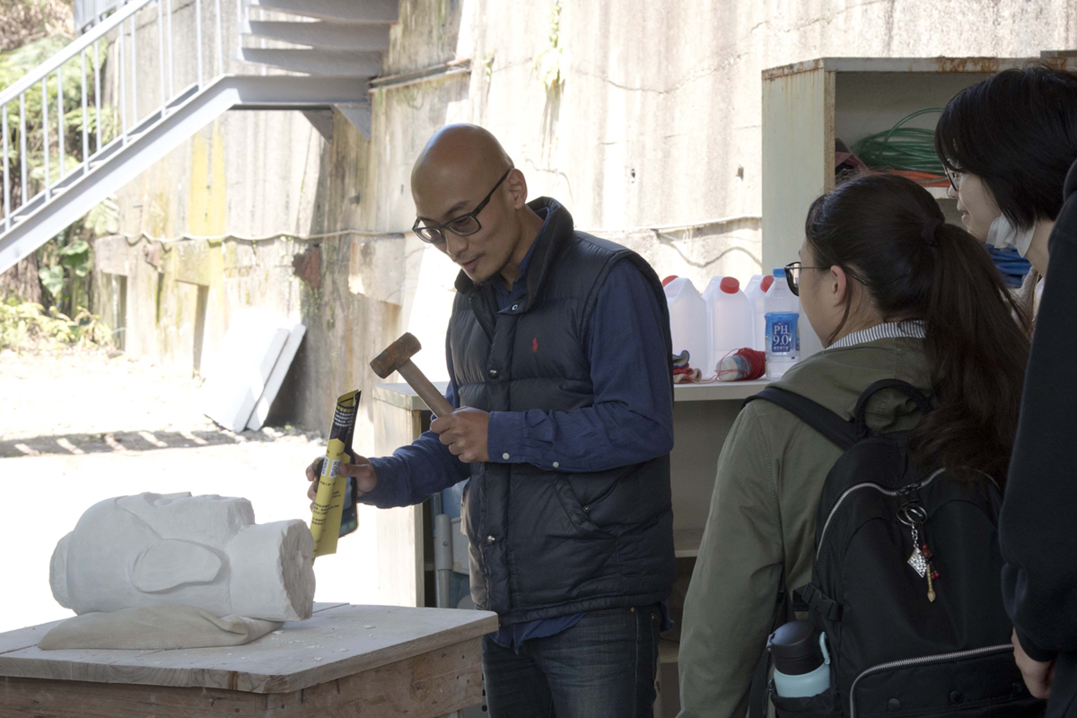 無界塾實驗教育機構曲智鑛副塾長(左)對於石雕工坊感到驚艷。