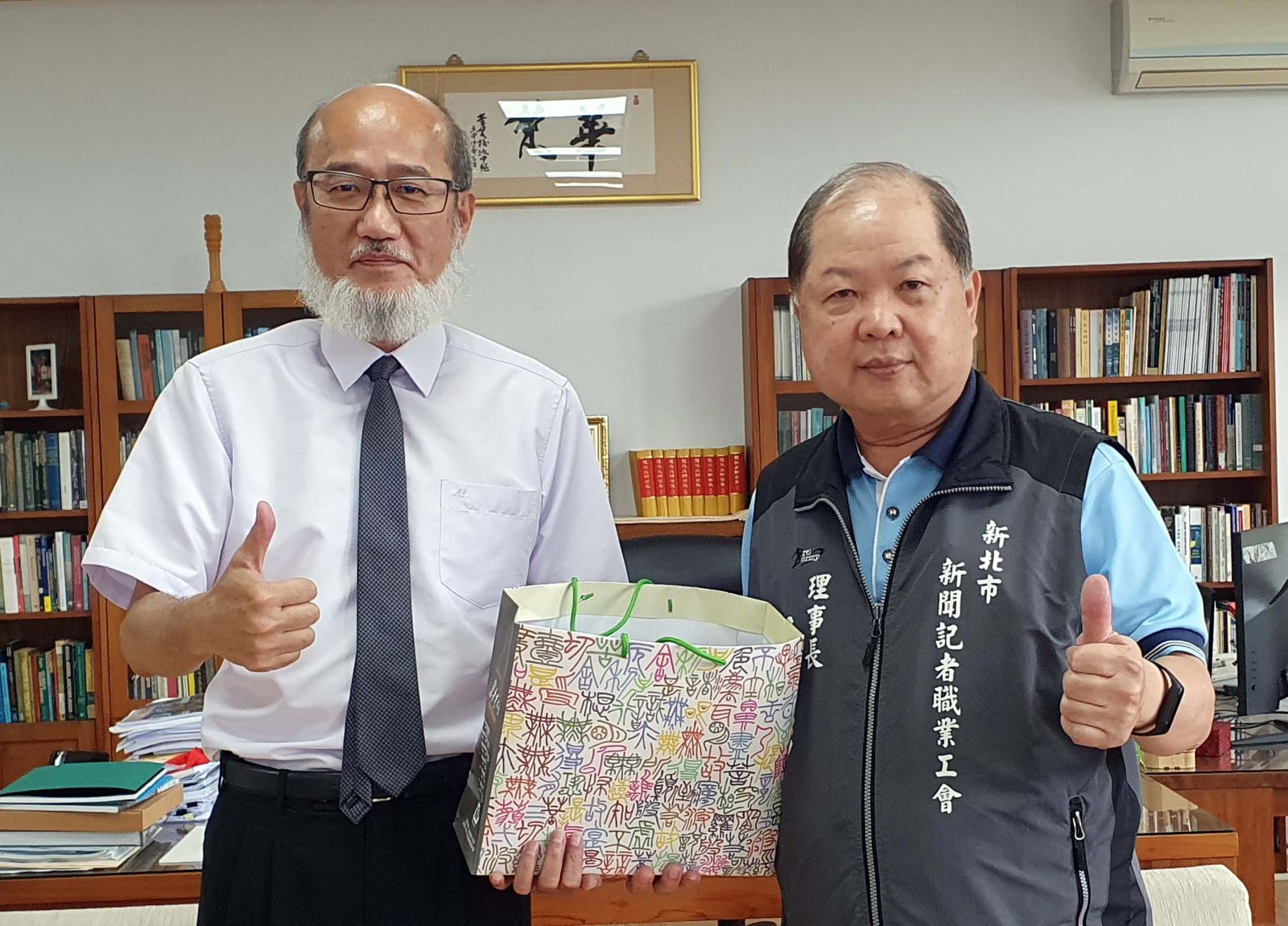華梵大學林從一校長(左)熱情歡迎新北市新聞記者職業工會黃村杉理事長率隊來訪。