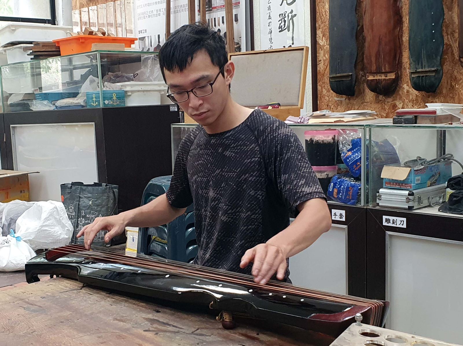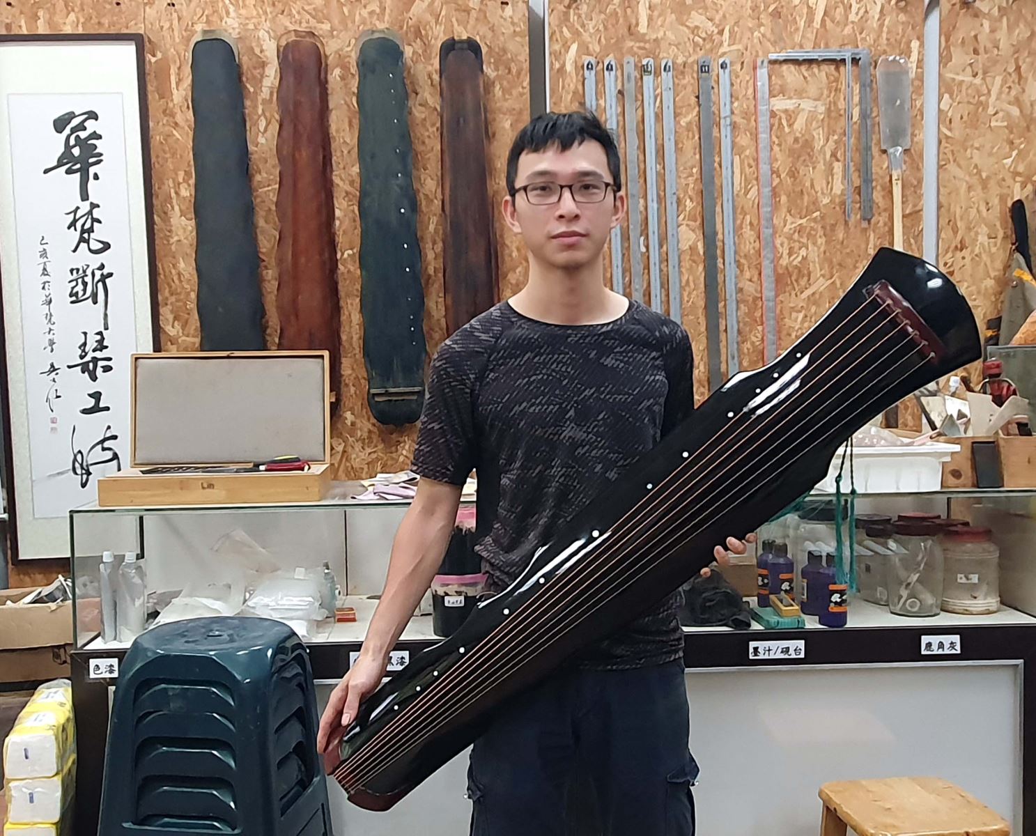 華梵大學佛教藝術學系碩士班學生洪于翔展示自己製作的古琴。