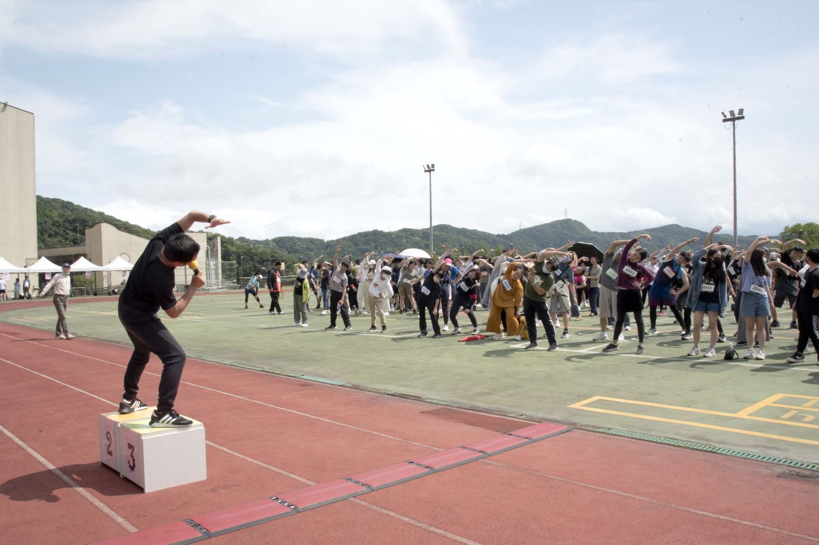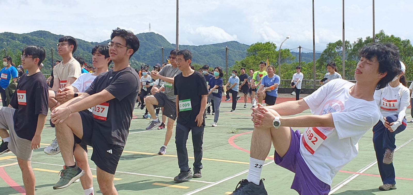 參加越野賽的同學在賽前開心熱身。