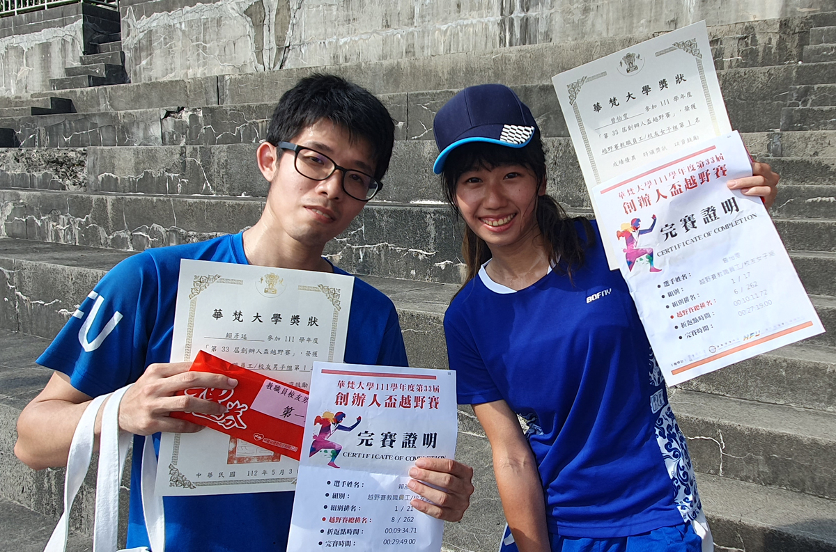 華梵校友曾怡雯(右)與賴彥廷專程返校參加越野賽,雙雙奪得冠軍。