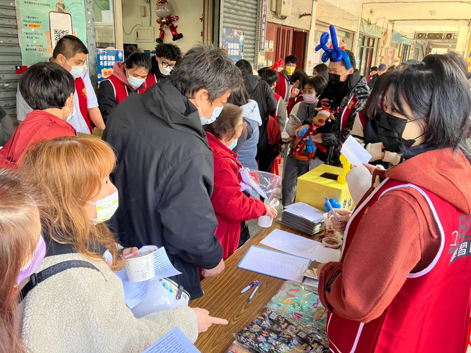 只見活動尚未開始,里辦公處外就已大排長龍,為了不讓里民們在寒風中等待太久,華梵同學們趕緊將氣球打氣,摺成各式各樣的造型,發給早早前來排隊的里民;也聽見里民們分享:「這裡從未有過這樣的活動,所以看到傳單,就很期待與小孩和孫子來參加」、「我好早就報名要來做植物染環保袋了!」、「小孩很期待要來作聖誕帽」……等。