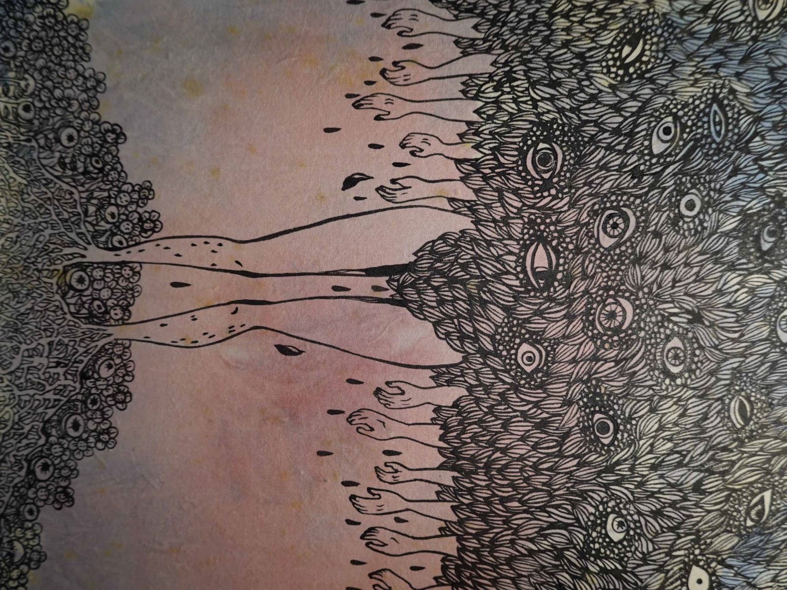 四年前自華梵大學畢業的謝子凡,學生時代以一手抽象的線條,完成介於唯美與身體感之間的作品〈頃溢〉,獲得黃智陽院長高度好評,買下她一系列的蜂巢創作,鼓舞了她繼續往更具思想性的藝術史領域鑽研。謝子凡說,創作需要沉澱與邏輯性,雖然現在就讀研究所,但未來仍不會放棄創作的志趣。