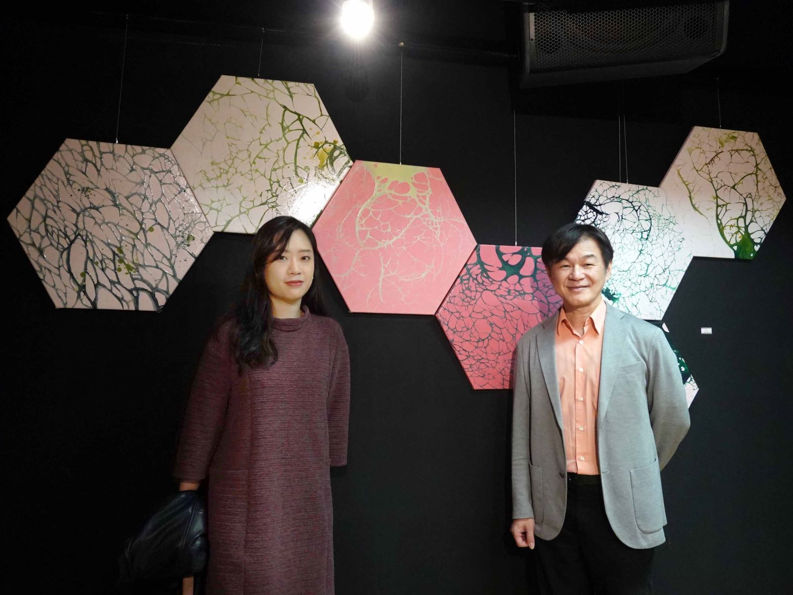 華梵大學校友謝子凡(左)在作品〈頃溢〉前與黃智陽院長合影。
