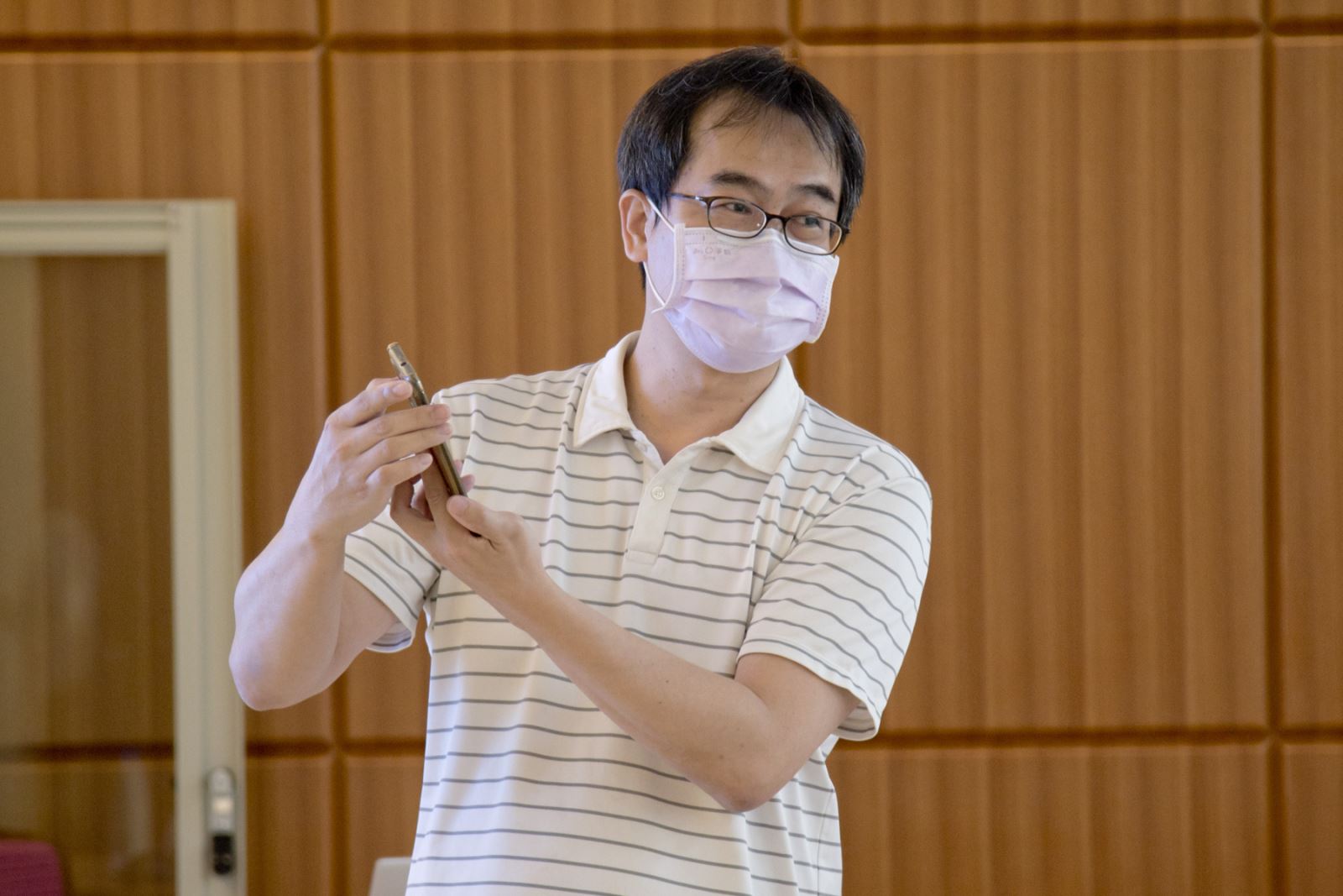 華梵大學智慧生活科技學院嚴建和院長以智慧型手機展示AI人工智慧。