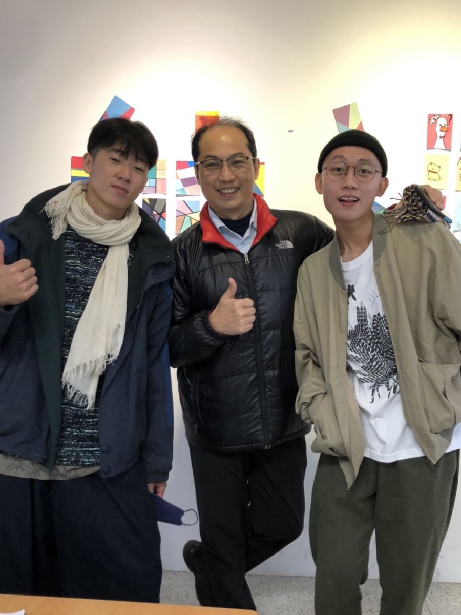 華梵大學授課老師董其融(左)、黃暐翔(右)與公務長黃明義教授在金山高中校際成果展現場。