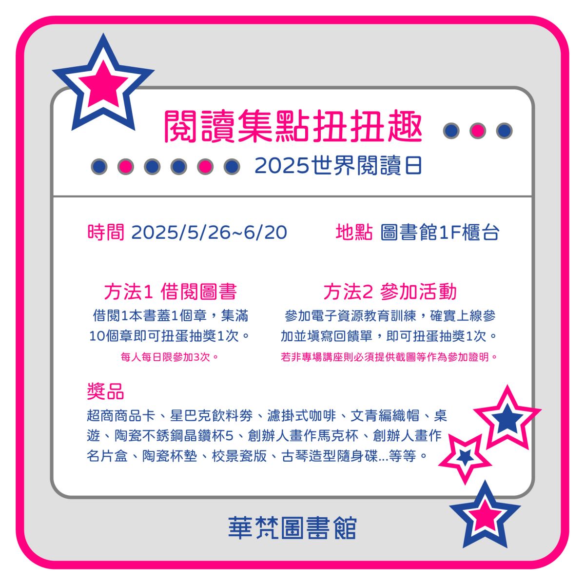 【華梵圖書館】【活動】閱讀集點扭扭趣(活動時間 2025/05/26~06/20)