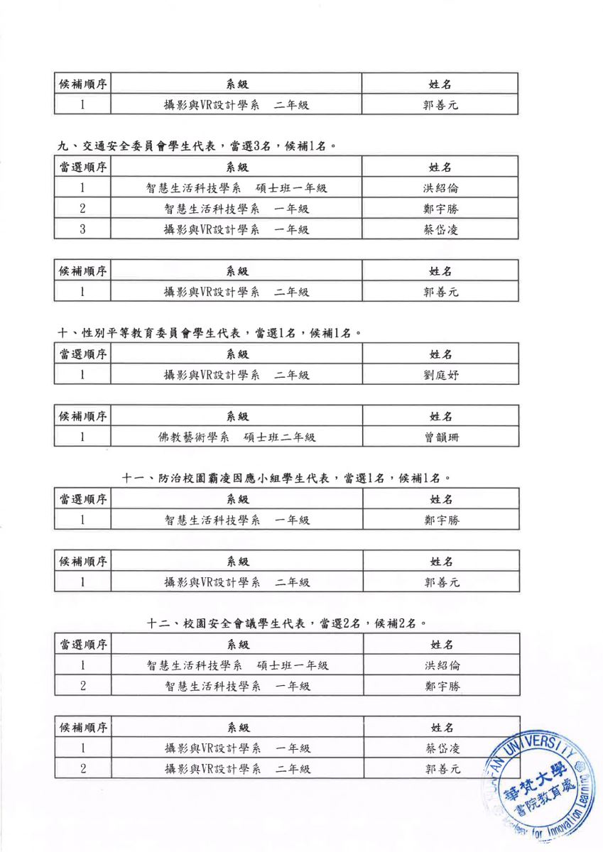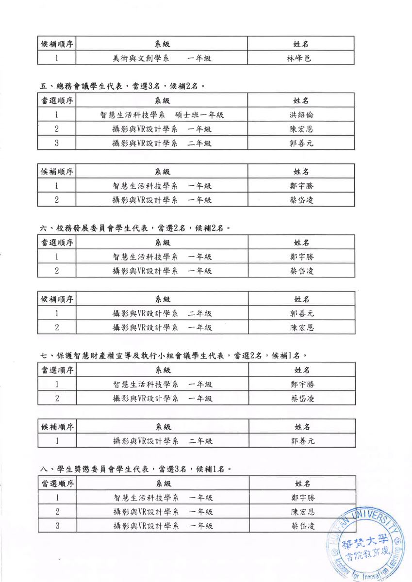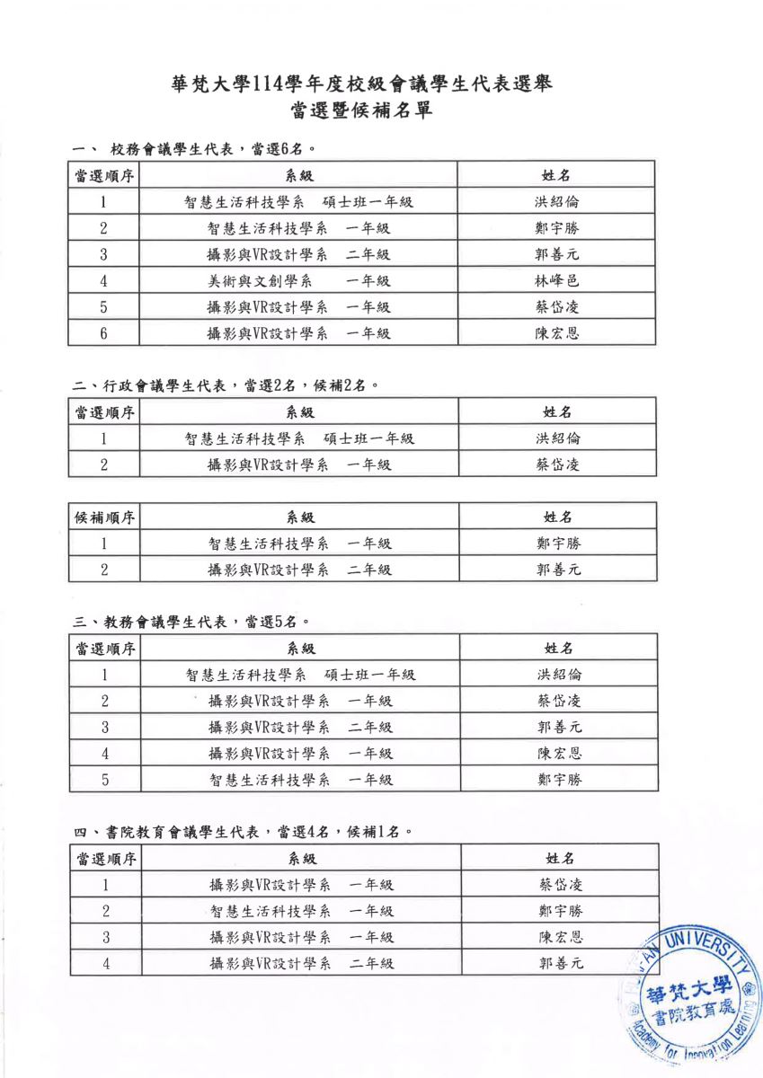 【公告】114學年度校級會議學生代表選舉當選暨候補名單