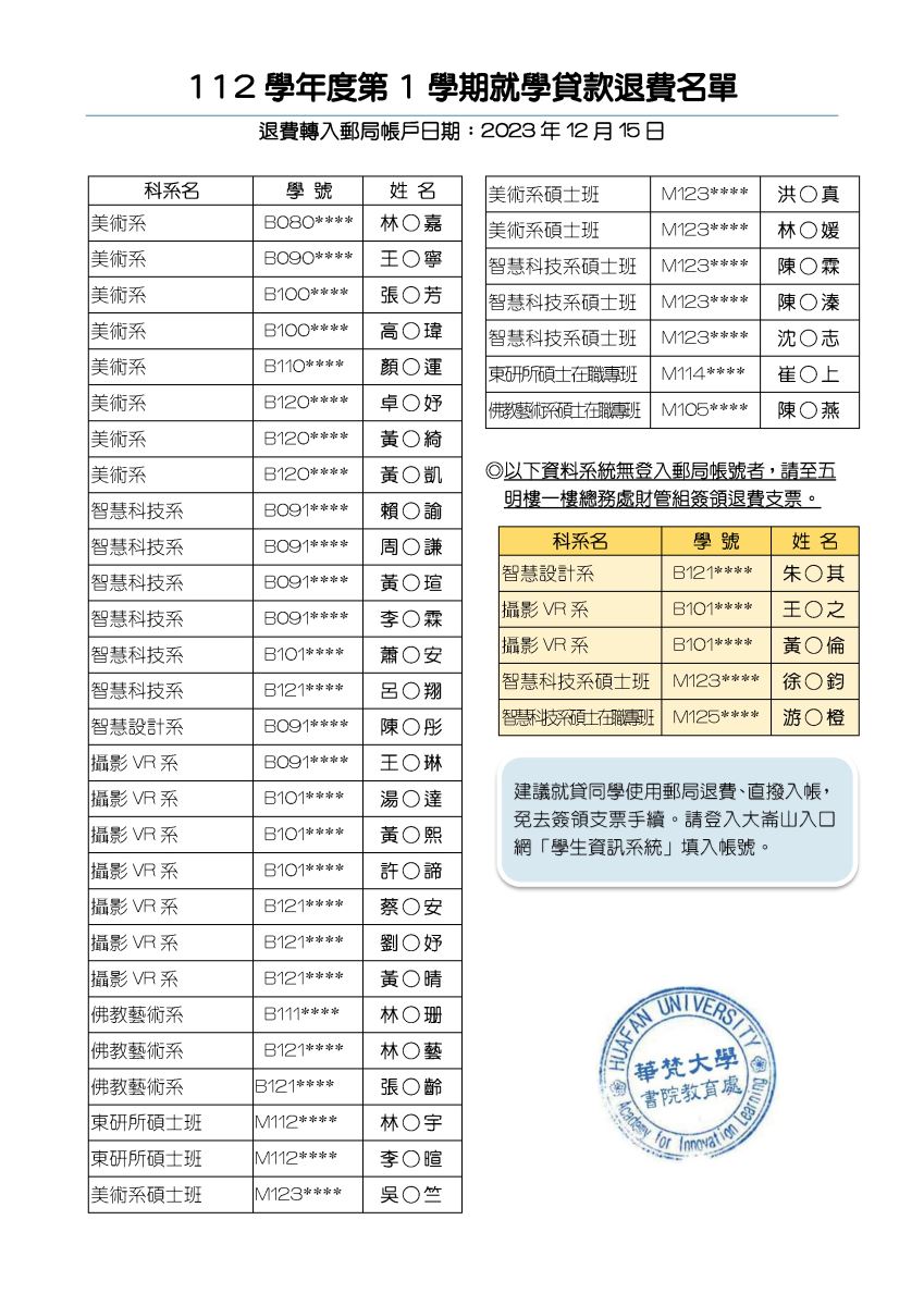 一、本學期申貸學生書籍費、校外住宿費、低(中)收入戶生活費及海外研修費者,訂於112年12月15日轉入個人郵局帳戶。