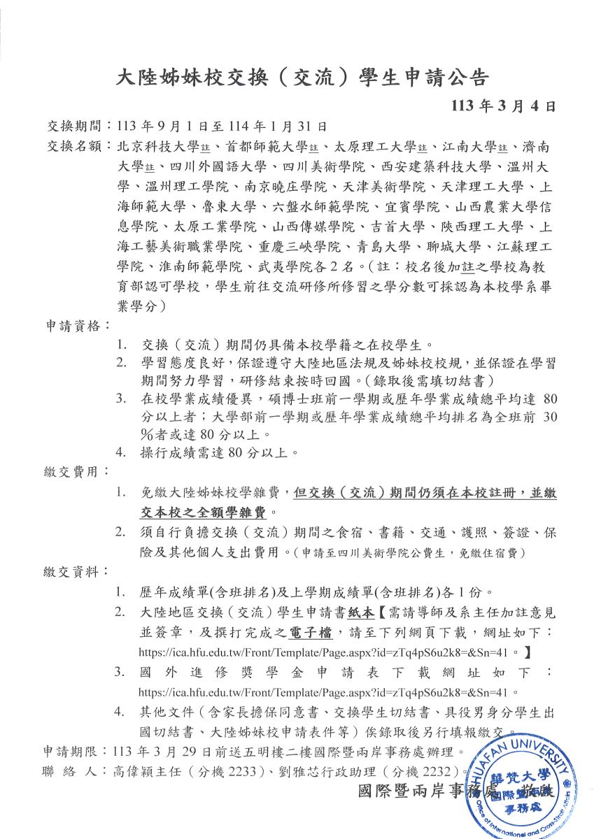 大陸姐妹校交換(交流)學生申請公告