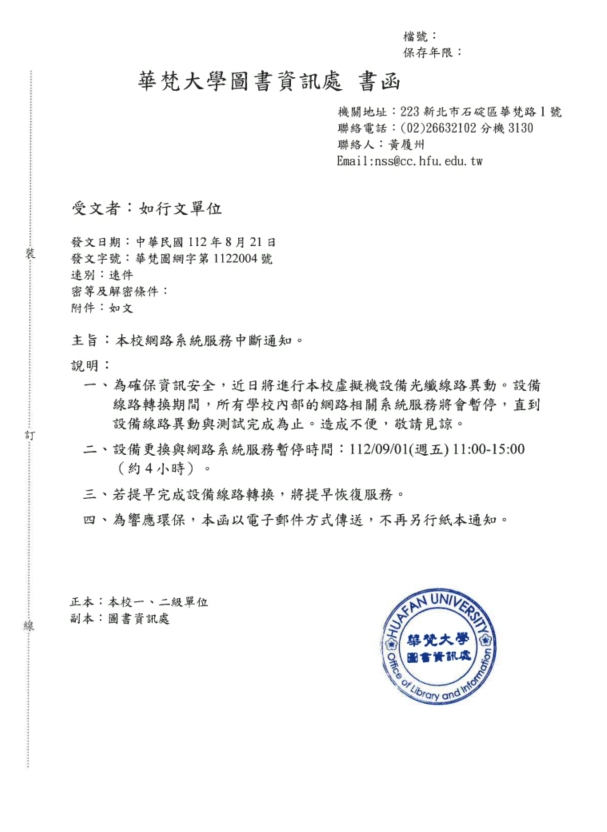 二、設備更換與網路系統服務暫停時間:112/09/01(週五) 11:00-15:00 (約4小時)。