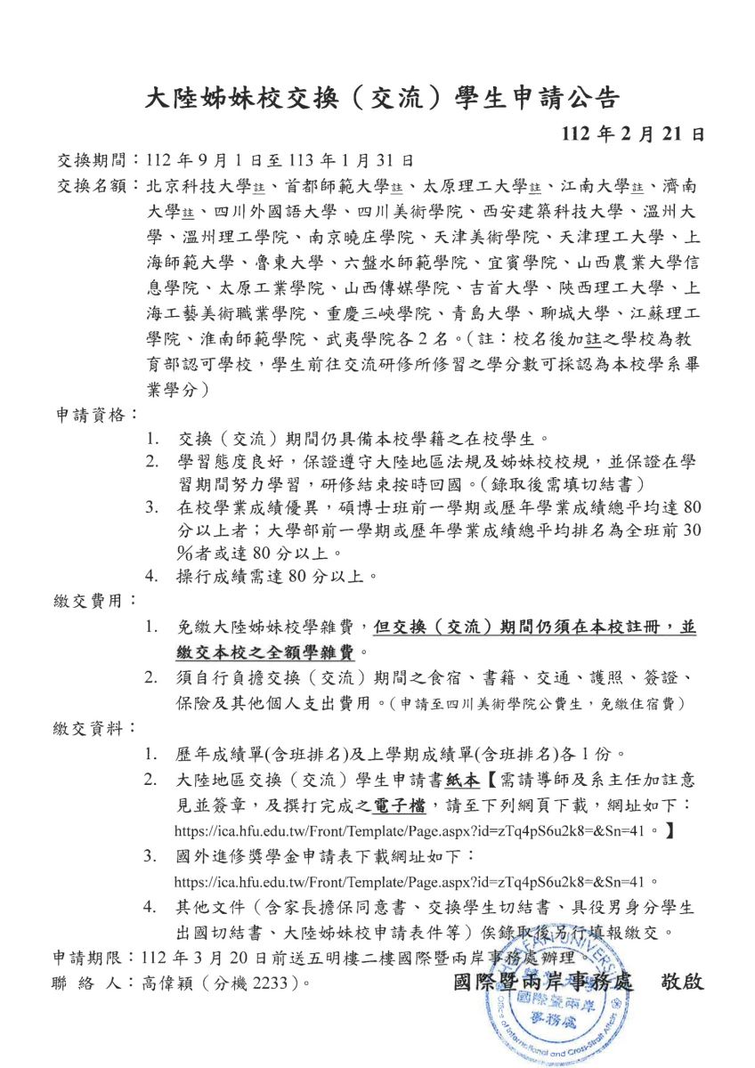 112學年第1學期赴大陸姐妹校交換學生申請公告