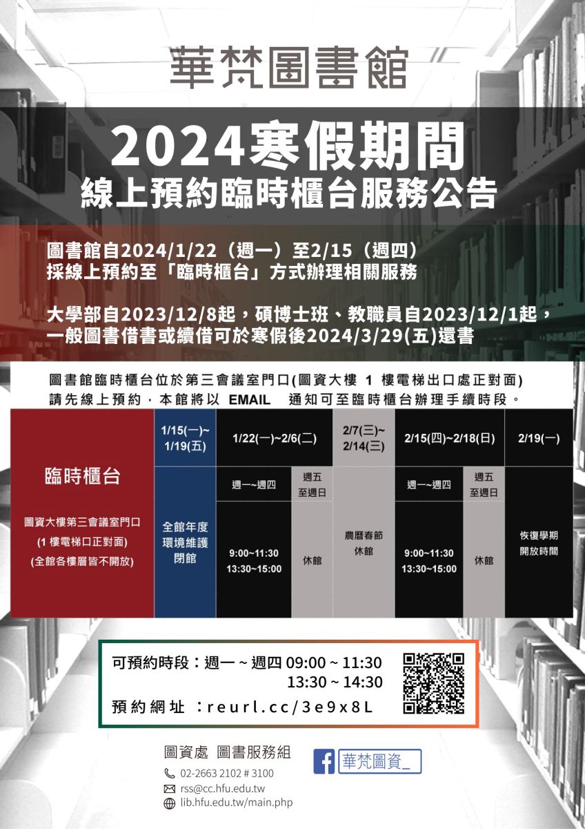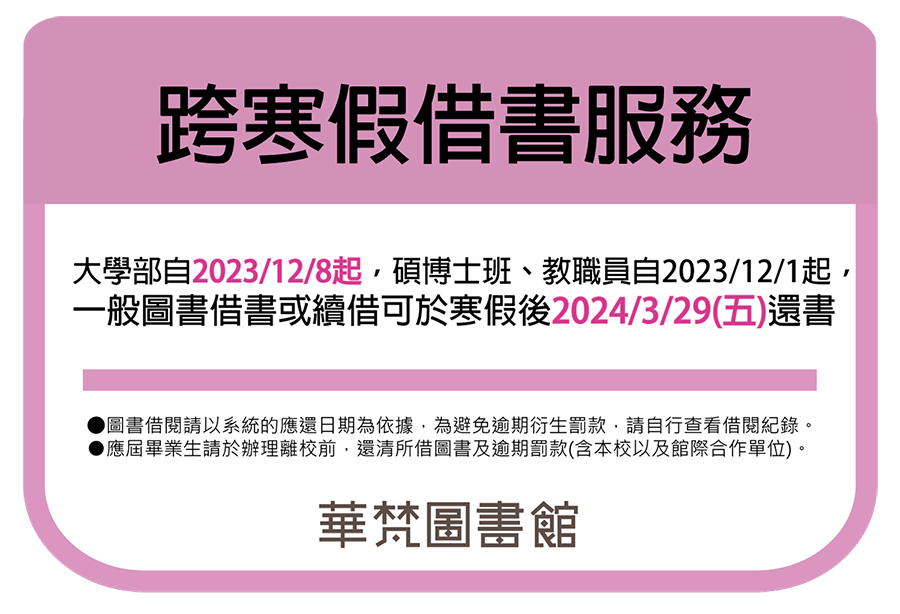 【華梵圖書館】2024年寒假期間圖書館服務說明(實施日期2024/1/15至2/18)(11/07更新)