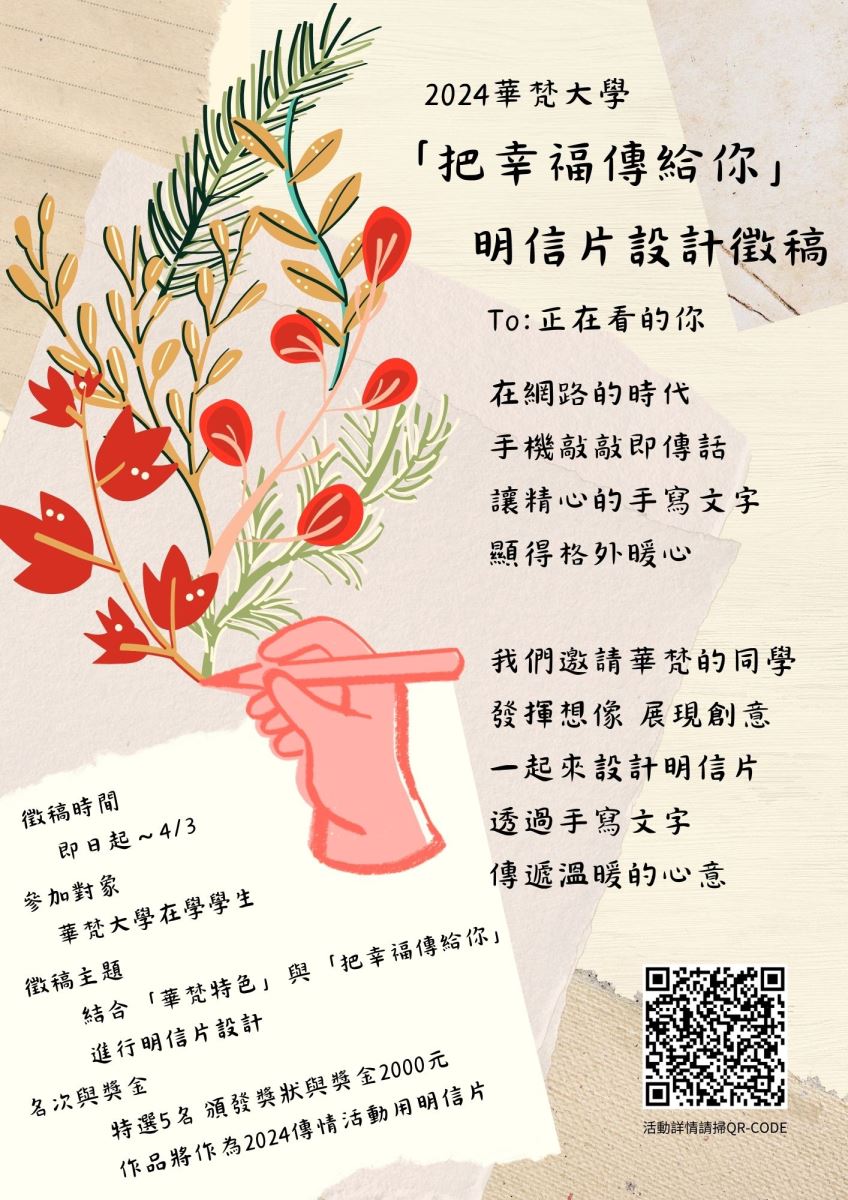 書院教育處邀請華梵的同學們,一起發揮所長、展現創意、設計傳遞幸福的明信片。