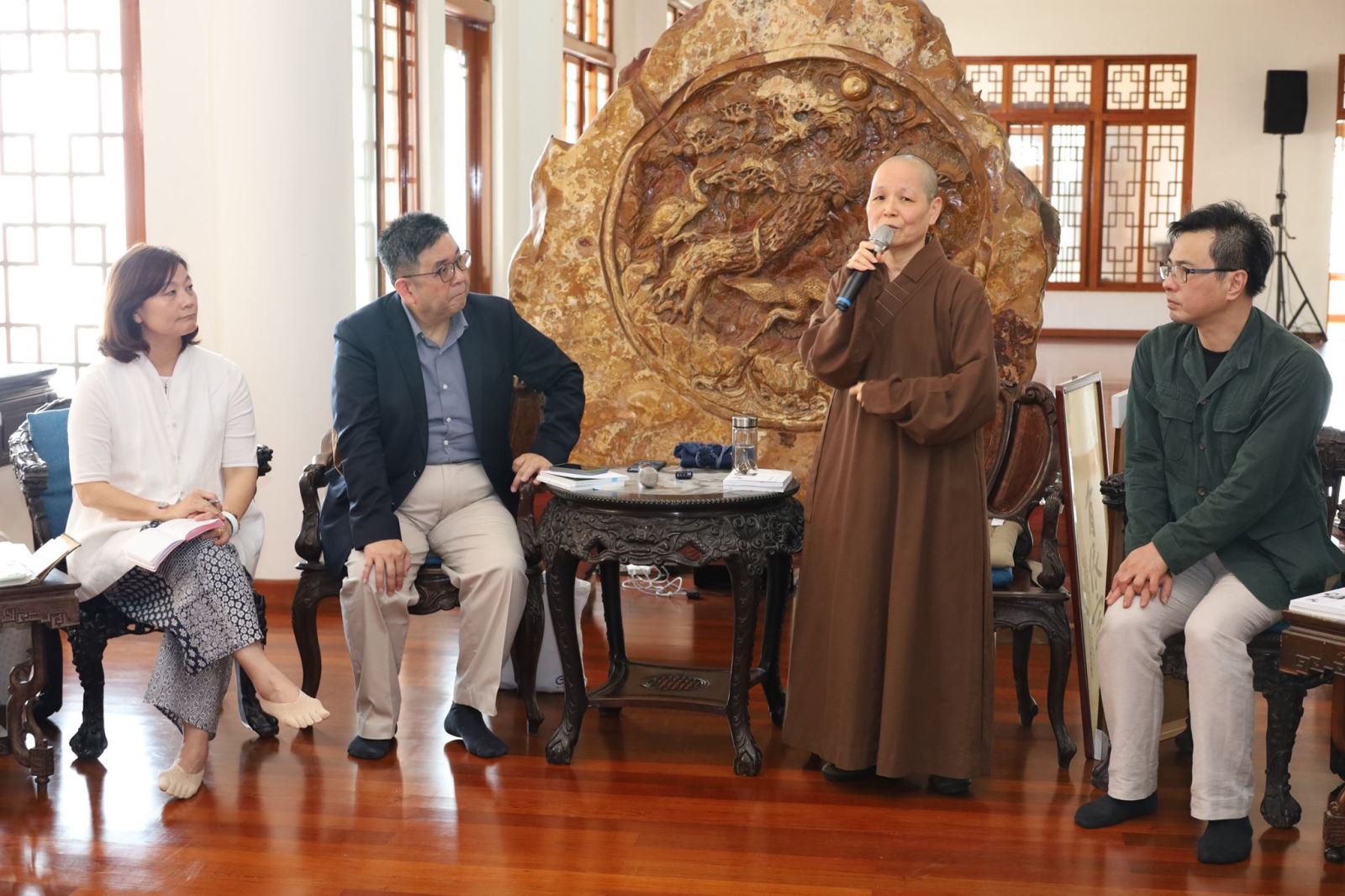 當天前來參與座談茶席的貴賓,還有拾得法師、華梵大學佛教藝術學系李蕭錕客座教授、有鹿出版社許悔之社長與臺大職能治療學系林克忠教授等人,拾得法師、李蕭錕教授與黃智陽院長並於開場前親自示範手作畫扇,林思伶局長則於座談會結束時輕聲朗誦悟觀法師詩作,讓一整天的活動在風雅的藝文氛圍中,充滿知性、感性與悟性,為「覺之教育」與「法華經者」留下圓滿句點。
