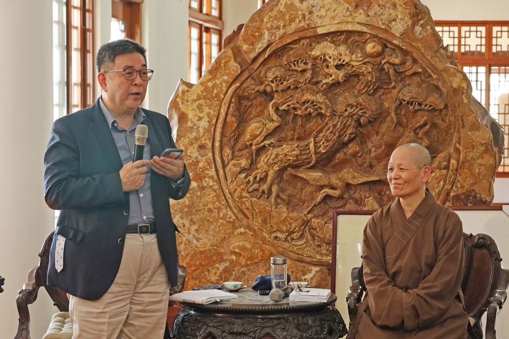拾得法師(左)與華梵大學佛教藝術學系李蕭錕教授(右)參與《法華經者的話》座談會。