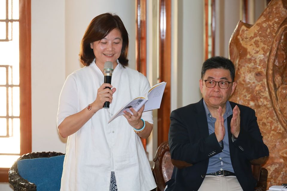高雄市文化局林思伶局長(左)朗誦悟觀法師詩作。