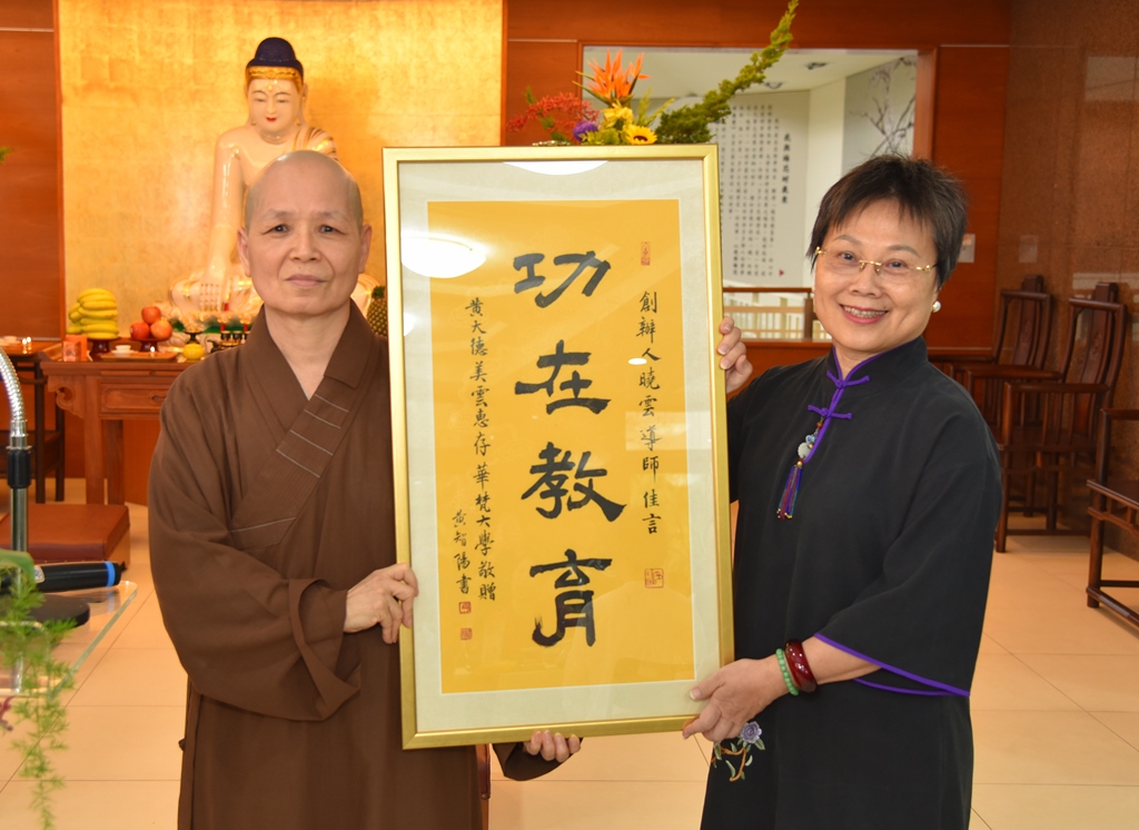 為表彰大眾對本校護持興學的貢獻,董事長悟觀法師代表學校致贈「功在教育」感謝狀給黃美雲居士。