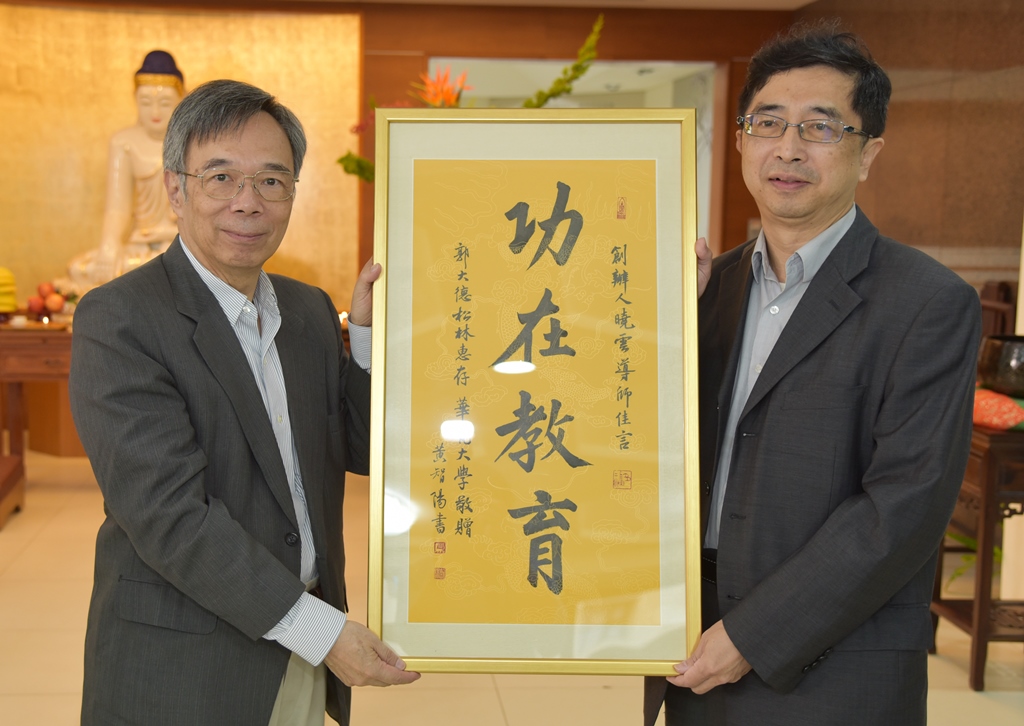 李復甸董事代表學校致贈「功在教育」感謝狀給郭松林居士,由蔡傳暉教務長代表接受。